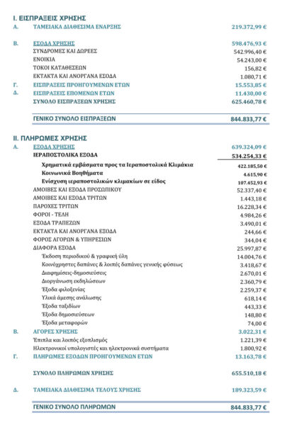 Παρόλο τον οικονομικό μαρασμό και την καθημερινή αφαίμαξη των οικονομικών πόρων των Ελλήνων, η Αδελφότητα κατάφερε να συγκεντρώσει το ποσό των 625.460,78 χιλιάδων ευρώ.