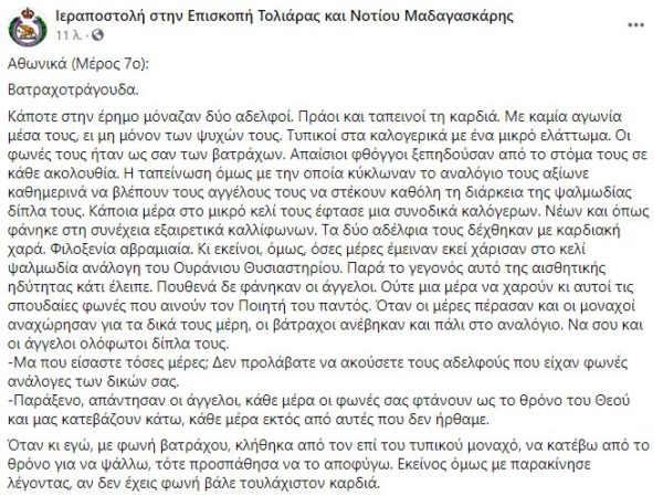 “Κάποτε στην έρημο μόναζαν δύο αδελφοί. Πράοι και ταπεινοί τη καρδιά. Με καμία αγωνία μέσα τους, ει μη μόνον των ψυχών τους. Τυπικοί στα καλογερικά με ένα μικρό ελάττωμα. Οι φωνές τους ήταν ως σαν των βατράχων” εκκινεί τη διηγησή του σε επίκαιρη ανάρτηση του, ο Θεοφιλέστατος Επίσκοπος Τολιάρας και Νοτίου Μαδαγασκάρης κ. Πρόδρομος.