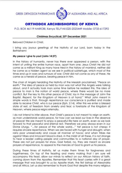 Στο μήνυμά του για τα Χριστούγεννα, ο Σεβασμιώτατος μίλησε για το νόημα της ειρήνης, όπως την εννοούσαν οι άγγελοι, ψέλνοντας το «δόξα εν υψίστοις Θεώ και επί γης ειρήνη, εν ανθρώποις ευδοκία” (Λουκάς 2/β: 14), λέγοντας πως μόνο μέσω της μετάνοιας μπορεί κανείς να φτάσει στην κατά Θεόν ειρήνη.