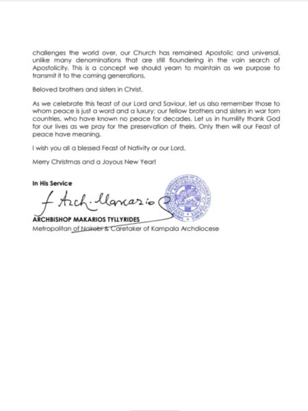 Μετά την πανηγυρική Θεία Λειτουργία, στις 25 Δεκεμβρίου 2021, ο Σεβασμιώτατος Μητροπολίτης Γέρων Ναϊρόμπι κ. Μακάριος μοίρασε μεσημεριανό γεύμα σε περίπου 1.000 παιδιά, γυναίκες και νέους από τη γειτονική του κοινότητα. «Είναι πάντα ευλογία να φιλοξενούμε αυτούς τους χαρούμενους ανθρώπους και να μοιραζόμαστε τα λίγα που έχουμε. Ιδιαίτερες ευχαριστίες σε όσους υποστηρίζουν αυτόν τον ευγενή σκοπό χωρίς να ξεχνάμε την Action2Day, την ActionToday Ngo, την εταιρεία Delmonte και το ξενοδοχείο Heron για την υποστήριξη αυτής της εκδήλωσης. Καλά Χριστούγεννα και ο Θεός να σας έχει όλους καλά!»