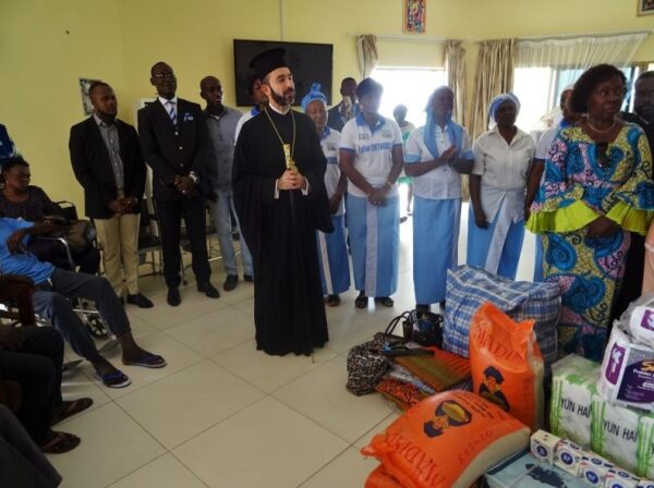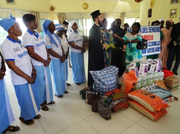 Ακολούθως ο Σεβασμιώτατος, συνοδευόμενος από τον δραστήριο Εφημέριο π.Ιάκωβο Ntsoumou Miayokela, μέλη της Εκκλησιαστικής Επιτροπής και μέλη της χορωδίας του Ι.Ενοριακού Ναού Αναστάσεως του Κυρίου Brazzaville, πραγματοποίησε επίσκεψη στον Οίκο Γερόντων (Maison des Seniors) στο φτωχό και απομακρυσμένο προάστιο Mfilou της κονγκολέζικης πρωτεύουσας, για να προσφέρει ποσότητα τροφίμων, ειδών ατομικής υγιεινής και παραδοσιακών υφασμάτων προς ένδυση των περιθαλπομένων αδελφών.