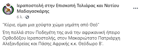 17/02/2021 17/02/2021 “Κύριε, είμαι μια χούφτα χώμα γεμάτη από Θεό” επιγράφεται η επίκαιρη ανάρτηση της Επισκοπής Τολιάρας και Νοτίου Μαδαγασκάρης επ’ αφορμή των Ονομαστηρίων του Πατριάρχου Αλεξανδρείας. “Έτη πολλά στον Ποδηγέτη της ανά την αφρικανική ήπειρο Ορθοδόξου Ιεραποστολής, στον Μακαριώτατο Πατριάρχη Αλεξανδρείας και Πάσης Αφρικής κ.κ. Θεόδωρο Β'”.
