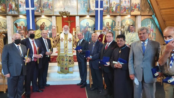 Κατά τη διάρκεια της Θείας Λειτουργίας, ο Μακαριώτατος απένειμε τιμητικές διακρίσεις σε έγκριτα μέλη της ομογένειας.