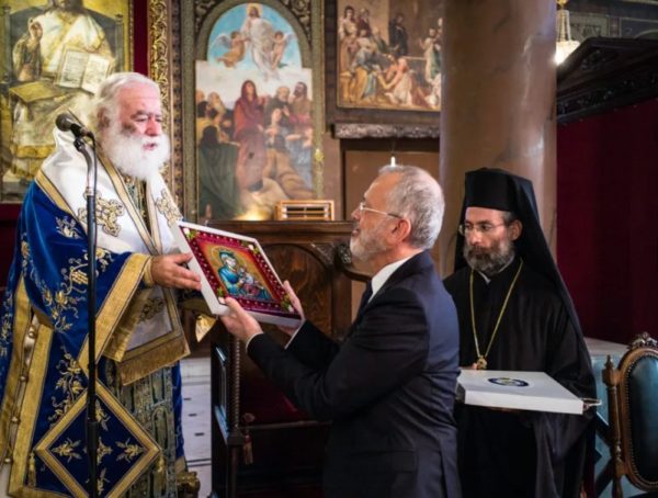 Καλωσόρισε και ευχήθηκε κάθε επιτυχία στην θητεία του νέου Έλληνα Πρέσβη, του οποίου και προσέφερε μια καλαίσθητη εικόνα της Παναγίας επ’ ευκαιρία της ανάληψης των νέων καθηκόντων του στο Καΐρο, αλλά και της ονομαστικής του εορτής.