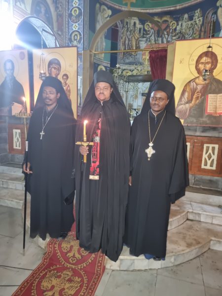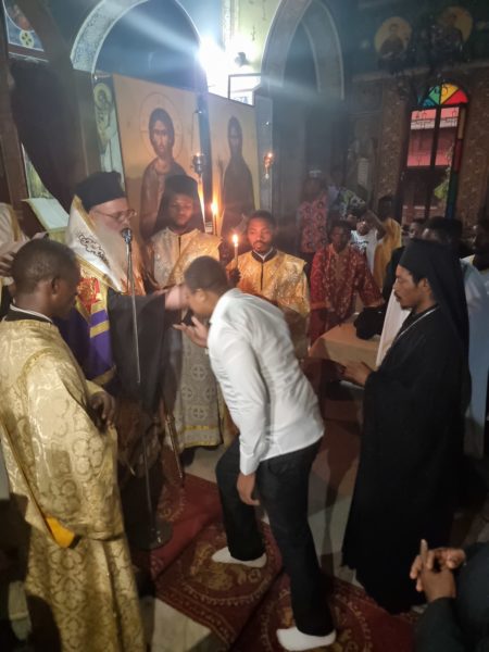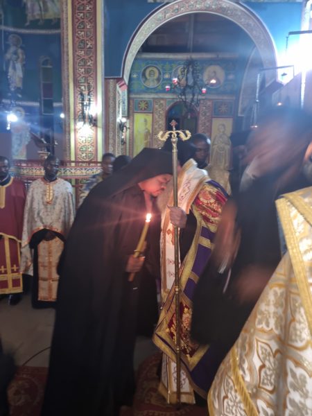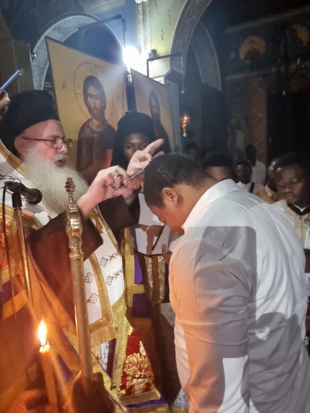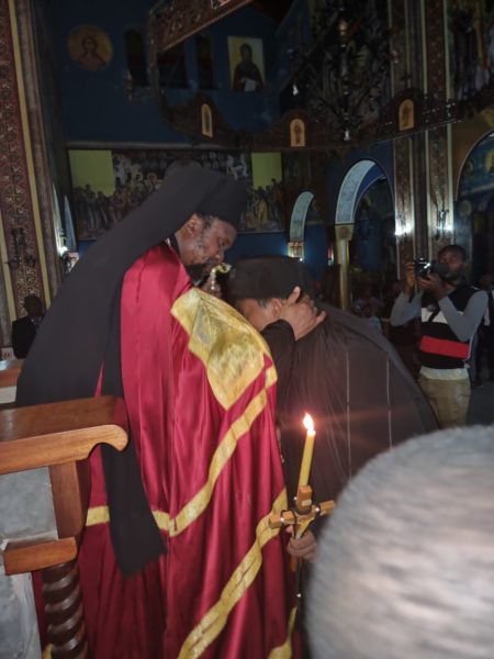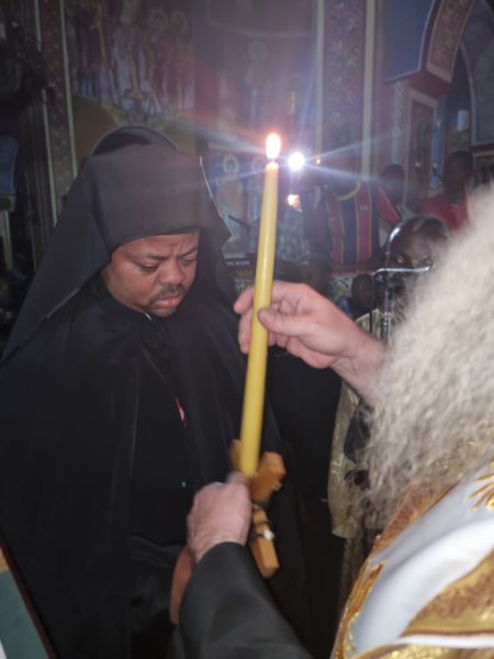 Την μοναχική κουρά τέλεσε ο Μητροπολίτης Κινσάσας κ. Θεοδόσιος. Προσφωνώντας τον κειρόμενο μοναχό ο Μητροπολίτης Κινσάσας αναφέρθηκε στην τελεία ζωή των μοναχών, η οποία μιμείται το βίο των Αγίων Αγγέλων και γι αυτό καλείται και αγγελικός βίος,στις βασικές αρετές του μοναχού,ενώ δεν παρέλειψε να τονίσει ότι πέραν των ίδιων των μοναχών τα μοναστήρια αποτελούν τόπους αγιασμού, παρηγοριάς, φωτισμού για όλον τον κόσμο.