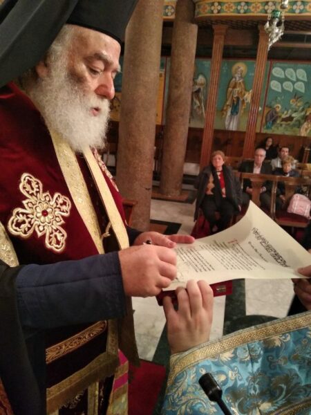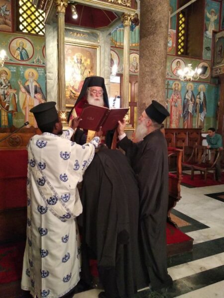 Πρό τοῦ πέρατος τῆς Θείας Λειτουργίας, ἡ Α. Θειοτάτη Μακαριότης, ὁ Πάπας καί Πατριάρχης, χειροθέτησε στό Ὀφφίκιο τοῦ Γέροντος Σκευοφύλακος τῶν Πατριαρχείων καί τῆς Ἱ. Πατριαρχικῆς Μονῆς τοῦ Ὁσίου Σάββα τοῦ Ἡγιασμένου τόν Πανοσιολογιώτατο Ἀρχιμανδρίτη κ. Παῦλο Ἰωσηφίδη, τόν ὁποῖον καί συνεχάρη γιά τήν ἐν γένει προσφορά του στήν Ἐκκλησία, τήν θεολογική και μουσικολογική του κατάρτιση καί ἰδιαιτέρως γιά τό ἱεροκηρυκτικό καί πνευματικό του ἔργο, ἐκφράζων παραλλήλως τήν πατριαρχική Αὐτοῦ εὐαρέσκεια γιά τήν συνέχιση αὐτοῦ τοῦ ἔργου του στο Πατριαρχεῖο Ἀλεξανδρείας καί στήν Ἱ. Πατριαρχική Μονή τοῦ Ὁσίου Σάββα.