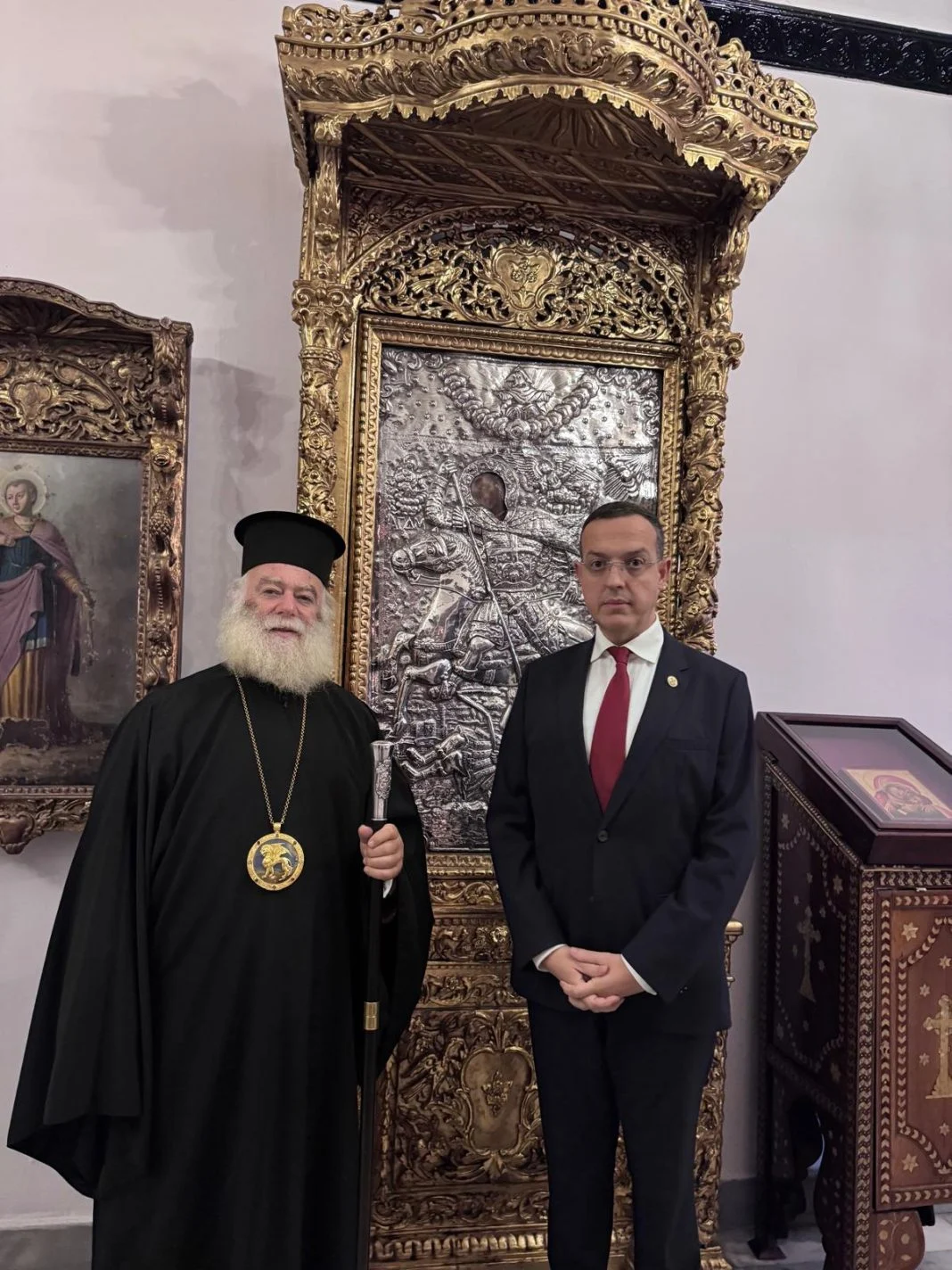 Τον Μακαριώτατο, συνοδευόμενο από τους Σεβασμιωτάτους Μητροπολίτες Γουϊνέας κ. Γεώργιο και Μέμφιδος κ. Νικόδημο, υποδέχθηκε ο Σεβασμιώτατος Μητροπολίτης Καλλιουπόλεως και Μαδύτου κ. Στέφανος, Αρχιερατικώς Προϊστάμενος της Κοινότητος Ταταούλων, μαζί με τον Ιερό Κλήρο και τον Πρόεδρό της, κ. Γεώργιο Θεοδωρίδη.