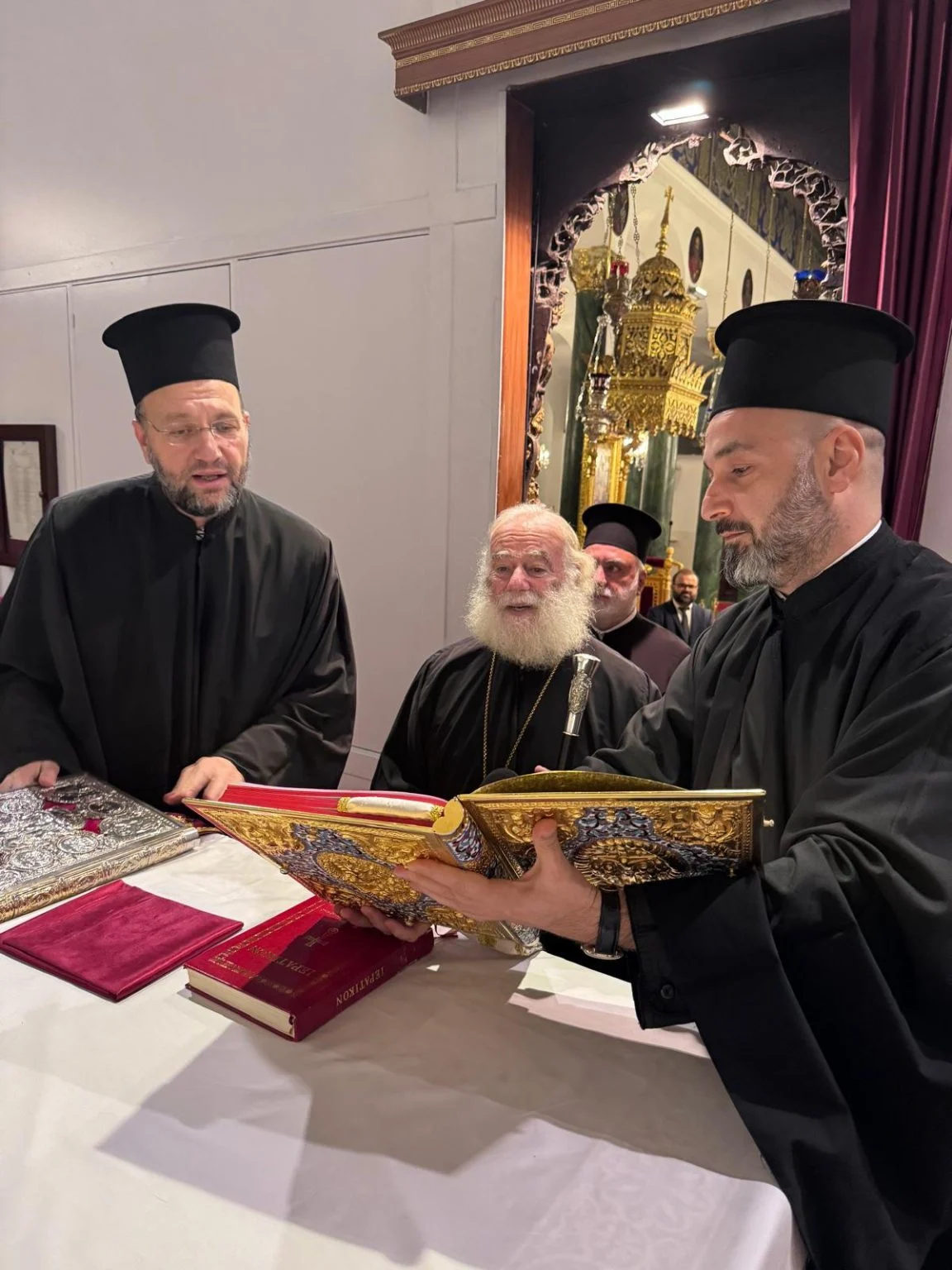 Στα επιδόρπια, προσφώνησε με ευλάβεια τον υψηλό επισκέπτη ο Αρχιερατικώς Προϊστάμενος, ενώ ο φιλοξενούμενος Προκαθήμενος αντιφώνησε με θερμούς λόγους.
