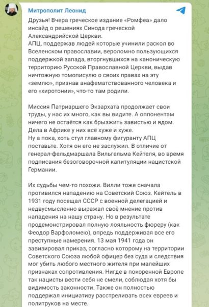 Την ίδια ώρα η πρώτη αντίδραση από την Ρωσική Εκκλησία για τις αποφάσεις που έλαβε το Δευτερόθρονο Πατριαρχείο σχετικά με τη δράση της Μόσχας και την εισπήδηση στην Αφρική, ήρθε από τον Μητροπολίτη Κλιν Λεωνίδα, ο οποίος καθαιρέθηκε από το Πατριαρχείο Αλεξανδρείας για βαρύτατα κανονικά παραπτώματα.