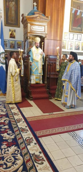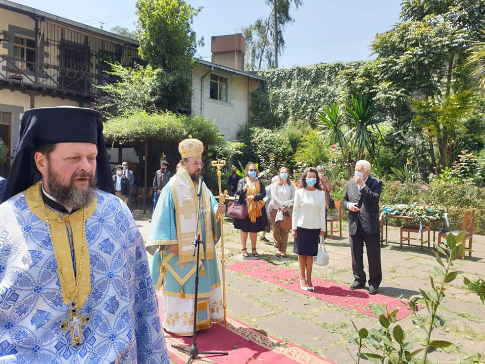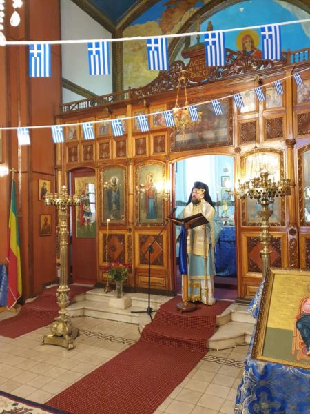 Της πανηγυρικής Αρχιερατικής Θείας Λειτουργίας και της επίσημης Δοξολογίας στον Καθεδρικό Ιερό Ναό Αγίου Φρουμεντίου προεξήρχε ο Σεβ. Μητροπολίτης Αξώμης κ. Δανιήλ, με την παρουσία της Εξοχ. Πρέσβεως της Ελλάδος στην Αιθιοπία κ. Άννας Φάρρου, του Εντιμ. Προέδρου της Ελληνικής Κοινότητας Αδδίς Αμπέμπα κ. Δημητρίου Συκά, των εκπροσώπου της Ελληνικής Αθλητικής Ενώσεως “Ολυμπιακός” κ. Χριστίνας Ροβέλια-Λαμπρινίδη και κ. Μαρίας-Σάρρας Αντύπα, των Ελλογιμ. Διευθυντών των Ελληνικών Σχολείων της Κοινότητας, της Ζεκείου Δημοτικής Σχολής κ. Αριστείδη Γιαννακού και του Μίχειου Γυμνασίου-Λυκείου κ. Γεωργίου Κατοπόδη, εκπαιδευτικών, μαθητών και πολλών πιστών Ορθοδόξων ομογενών, Αιθιόπων, Ρώσων, Σέρβων, Καναδών.