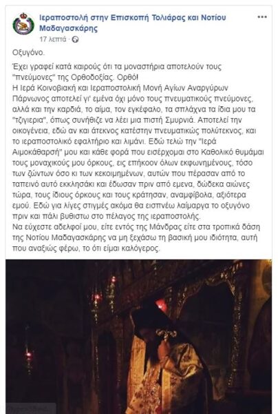 Σε σημερινή δημοσίευσή του, 22 Ιουνίου 2019, στη σελίδα “Ιεραποστολή στην Επισκοπή Τολιάρας και Νοτίου Μαδαγασκάρης” του κοινωνικού δικτύου Facebook, ο Επίσκοπος Τολιάρας και Νοτίου Μαδαγασκάρης, κ. Πρόδρομος, αναφέρεται στην Ιερά Κοινοβιακή και Ιεραποστολική Μονή Αγίων Αναργύρων Πάρνωνος, για την οποία, όπως λέγει χαρακτηριστικά:
