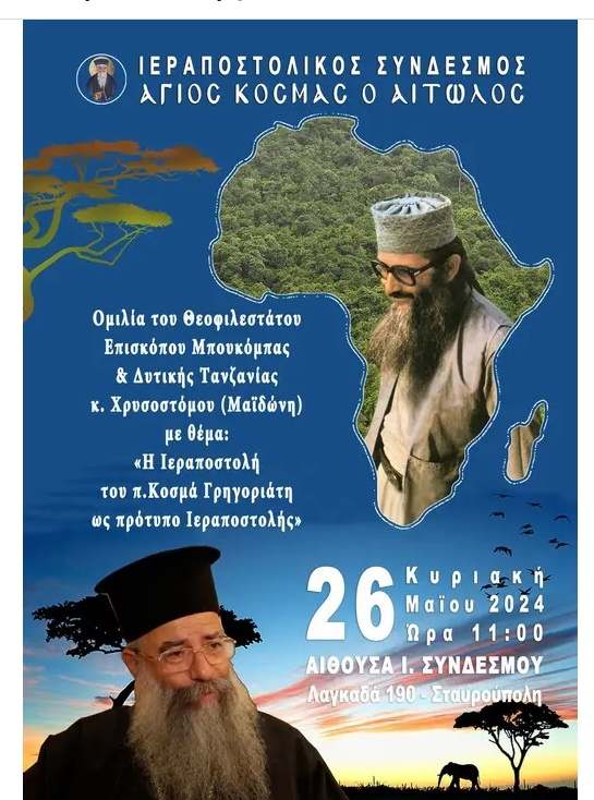 Ο Θεοφιλέστατος Επίσκοπος Μπουκόμπας και Δυτικής Τανζανίας κ. Χρυσόστομος θα μιλήσει με θέμα «Η ιεραποστολή του π. Κοσμά Γρηγοριάτη ως πρότυπο Ιεραποστολής», στις 26 Μαΐου στις 11πμ, στην αίθουσα του Ιεραποστολικού Συνδέσμου «Άγιος Κοσμάς ο Αιτωλός» (Λαγκαδά 190- Σταυρούπολη)