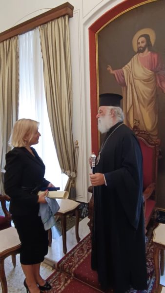 Ο Μακαριώτατος ενθυμήθηκε την ευγενή προθυμία της να τον συνοδεύει κατά την αναχώρηση του για τα μεγάλα ιεραποστολικά ταξίδια στην Αφρική, αλλά και κατά την επιστροφή του την μετά εγκαρδιότητος υποδοχή ρωτώντας με ζωηρό ενδιαφέρον για τις ιεραποστολικές δραστηριότητες που βοηθούν τους Αφρικανούς αδελφούς μας όχι μόνο στην πνευματική τους ζωή αλλά και στην ανθρώπινη επιβιωσή τους (δημιουργία σχολείων, νοσοκομείων και λοιπόν φιλανθρωπικών ιδρυμάτων). Όπως είπε ο Μακαριώτατος, με τον δικό της τρόπο ενίσχυσε την μεγάλη φιλία και συνεργασία των δύο χωρών Ελλάδας και Αιγύπτου. Επίσης, ο Πατριάρχης Αλεξανδρείας πρόσθεσε ότι η καλή επικοινωνία με τους εκπροσώπους της μητέρας Ελλάδος στην Αίγυπτο αποτελεί στήριξη για το Παλαίφατο Πατριαρχείο και τους διακονούντας σε αυτό. Την ευχαρίστησε διότι ήταν πάντα και σε καλή συνεργασία με Πατριαρχικό Επίτροπο του στο Κάϊρο, Μητροπολίτη Μέμφιδος κ. Νικόδημο και με τον Καθηγούμενο Αρχιμ. Δαμασκηνό. Εγκαρδίως της ευχήθηκε συντόμως να έχει καλή προαγωγή και να συνεχίσει με ζήλο το έργο της, που είναι έργο Εθνικό. Ο Άγιος Γεώργιος να την συνοδεύει πάντοτε στην ζωή της, κατέληξε ο Αλεξανδρινός Προκαθήμενος.