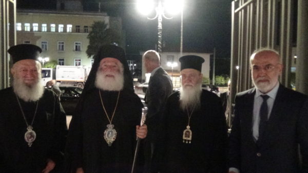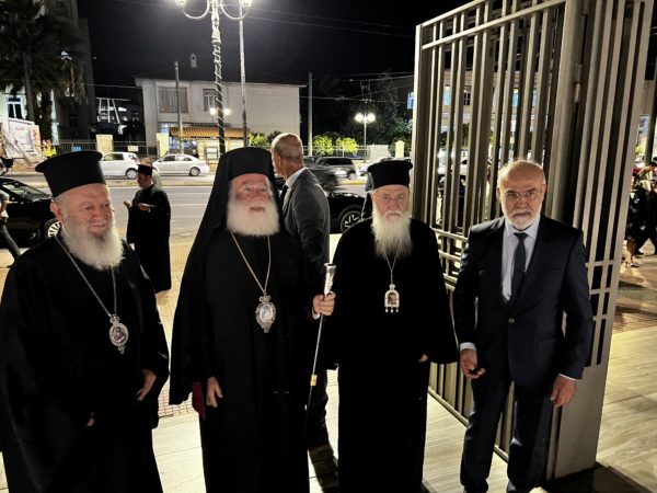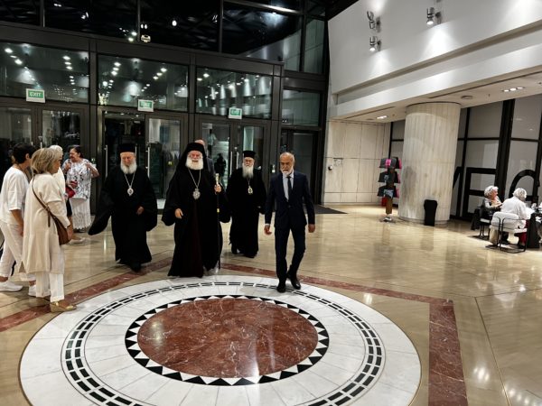Εν συνεχεία στην είσοδο του Αμφιθεάτρου Νίκος Σκαλκώτας υποδέχθηκε την Α.Θ.Μ. ο νεοεκλεγείς Μητροπολίτης Θεσσαλονίκης κ. Φιλόθεος και αμέσως μετά καλωσόρισε τον Πατριάρχη Αλεξανδρείας ο Αρχιεπίσκοπος Αθηνών και πάσης Ελλάδος κ.κ. Ιερώνυμος, μέλη της Οργανωτικής Επιτροπής του Συνεδρίου και μέλη της Ιεράς Συνόδου της Ιεραρχίας της Εκκλησίας της Ελλάδος.