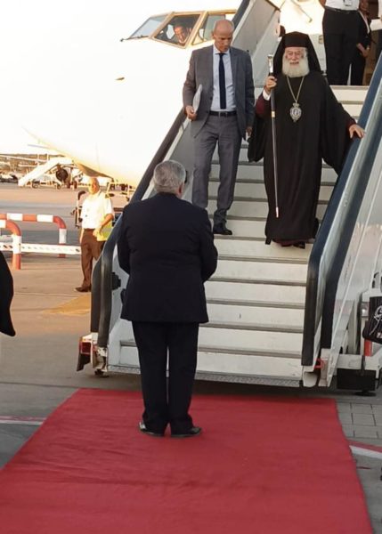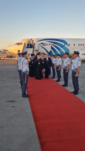 Τον Μακαριώτατο Πατριάρχη υποδέχθηκαν στον Διεθνή Αερολιμένα Αθηνών «Ελευθέριος Βενιζέλος» -όπου του αποδόθηκαν οι προβλεπόμενες τιμές από το άγημα της Αερονομίας της Πολεμικής Αεροπορίας- ο Αντιπρόεδρος της Οργανωτικής Επιτροπής και το Μέλος του Συνεδρίου Μητροπολίτες Χαλκίδος κ. Χρυσόστομος και Κορίνθου κ. Διονύσιος, αντίστοιχα.