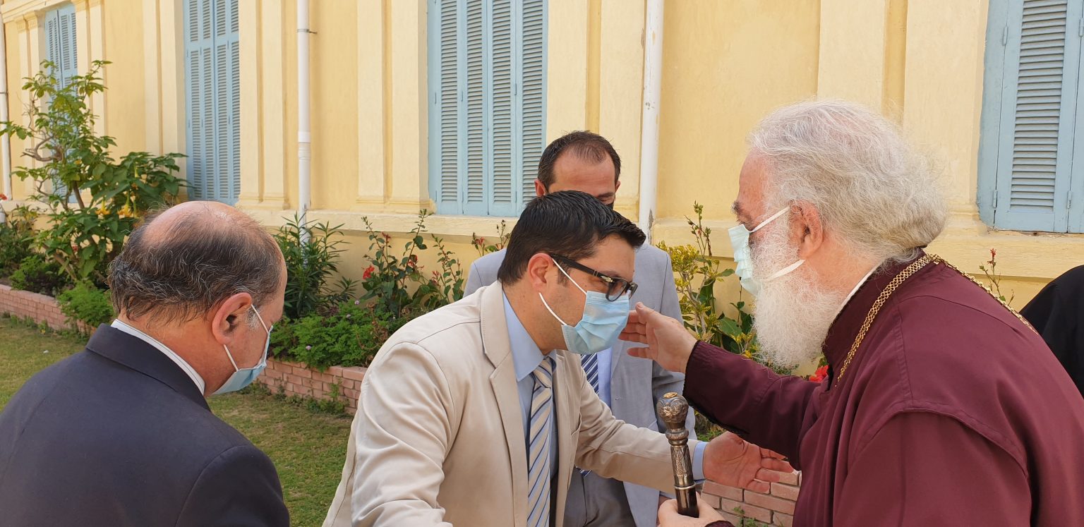 Τον Αλεξανδρινό Προκαθήμενο κ.κ. Θεόδωρο Β΄ που κατέφθασε στο χώρο του Ελληνικού Τετραγώνου του Σάτμπι με τον Πατριαρχικό Επίτροπο Αλεξανδρείας Μητροπολίτη Ναυκράτιδος κ. Νάρκισσο, υποδέχτηκαν ο Α΄ Αντιπρόεδρος της Ελληνικής Κοινότητας Αλεξανδρείας κ. Ανδρέας Βαφειάδης, ο Γενικός Γραμματέας της ΕΚΑ κ. Δημήτρης Κάβουρας και ο Κοινοτικός Επίτροπος και πρώην Αντιπρόεδρος κ. Νικόλας Κόπελος.