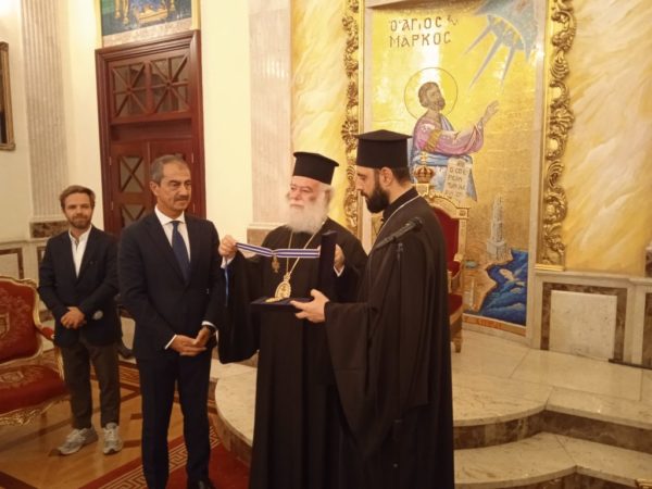 Συγκινητική η στιγμή κατά την οποία ο Πατριάρχης Αλεξανδρείας φόρεσε τον Ανώτερο Ταξιάρχη του Σάββα του Ηγιασμένου στο λαιμό του τιμώμενου κ. Βίγκα, εν μέσω χειροκροτημάτων των παρευρισκομένων που όλοι τους με μια φωνή φώναξαν επανειλημμένα «Άξιος».