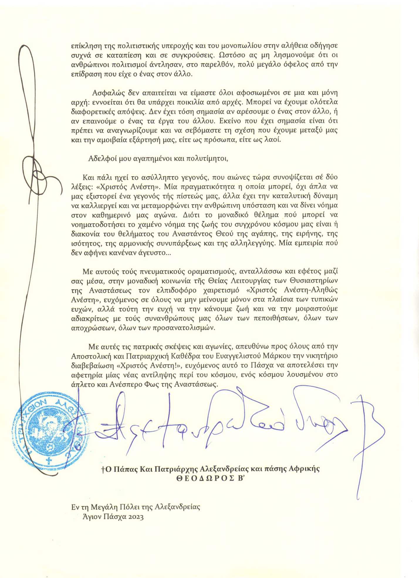 Με αυτές τις πατρικές σκέψεις και αγωνίες, απευθύνω προς όλους από την Αποστολική και Πατριαρχική Καθέδρα του Ευαγγελιστού Μάρκου την νικητήριο διαβεβαίωση «Χριστός Ανέστη!», ευχόμενος αυτό το Πάσχα να αποτελέσει την αφετηρία μιας νέας αντίληψης περί του κόσμου, ενός κόσμου λουσμένου στο άπλετο και Ανέσπερο Φως της Αναστάσεως.