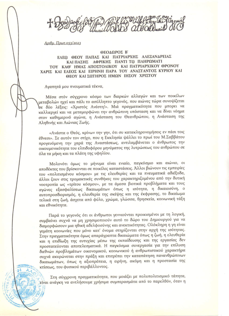 Το μήνυμα για το Πάσχα του 2023 του Πάπα και Πατριάρχη Αλεξανδρείας και Πάσης Αφρικής κ.κ. Θεόδωρου Β’