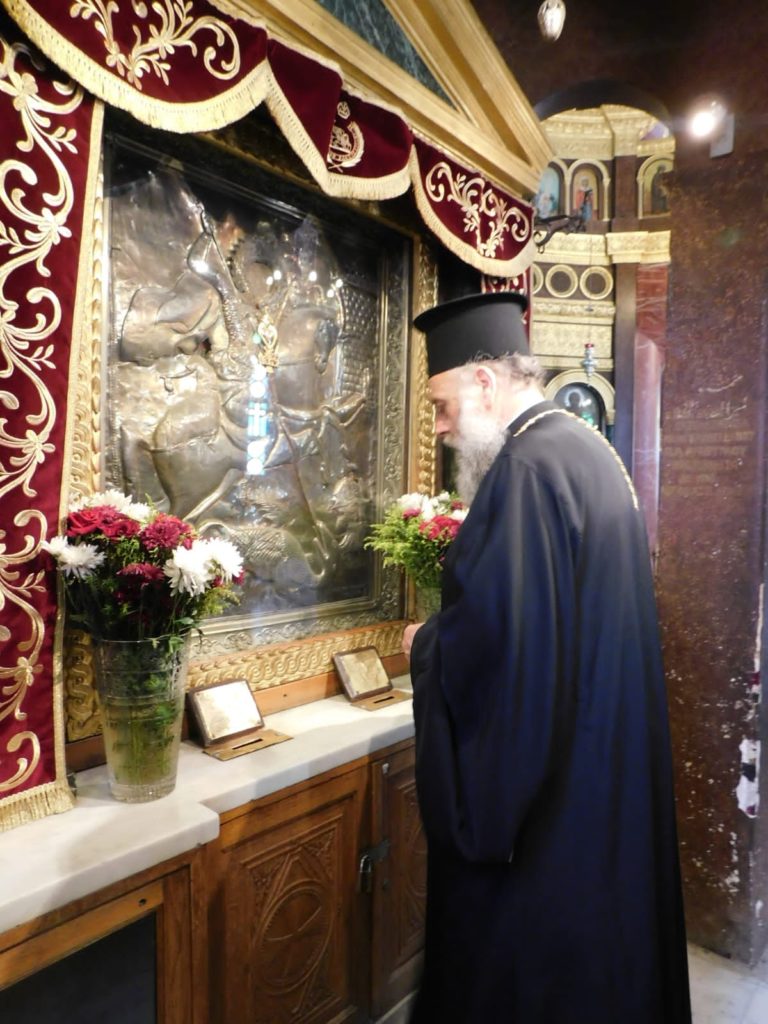 O Μητροπολίτης Θεσσαλιώτιδος προσκύνησε ευλαβικά την εικόνα του Αγίου Γεωργίου, η οποία δεσπόζει στο Καθολικό της Ροτόντας της Ανατολής.