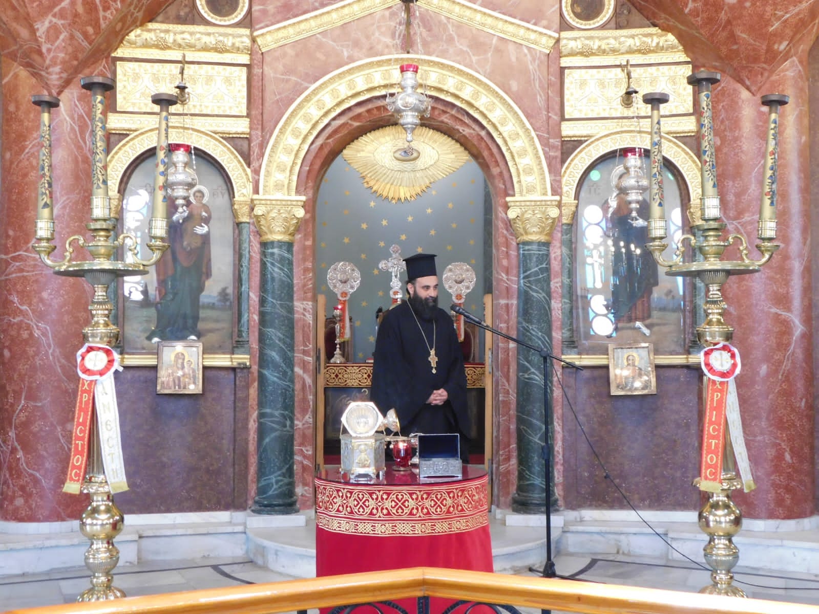 O Μητροπολίτης Θεσσαλιώτιδος προσκύνησε ευλαβικά την εικόνα του Αγίου Γεωργίου, η οποία δεσπόζει στο Καθολικό της Ροτόντας της Ανατολής.