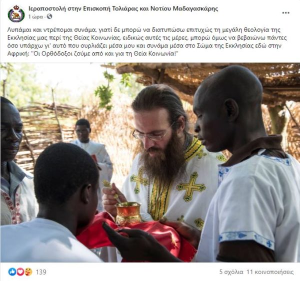 “Λυπάμαι και ντρέπομαι συνάμα, γιατί δε μπορώ να διατυπώσω επιτυχώς τη μεγάλη θεολογία της Εκκλησίας μας περί της Θείας Κοινωνίας, ειδικώς αυτές τις μέρες, μπορώ όμως να βεβαιώνω πάντες όσο υπάρχω γι’ αυτό που ουρλιάζει μέσα μου και συνάμα μέσα στο Σώμα της Εκκλησίας εδώ στην Αφρική: ”Οι Ορθόδοξοι ζούμε από και για τη Θεία Κοινωνία!”” αναφέρει σε ανάρτησή του ο Επίσκοπος Τολιάρας και Νοτίου Μαδαγασκάρης κ. Πρόδρομος.