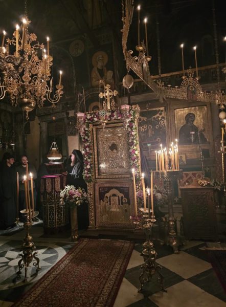 Το απόγευμα της Δευτέρας 23 Ιουνίου, οι προσκυνητές προσήλθαν στον ιστορικό Ναό του Πρωτάτου, στις Καρυές, για να συνεορτάσουν την πανήγυρι της Υπεραγίας Θεοτόκου “Άξιον Εστί”.