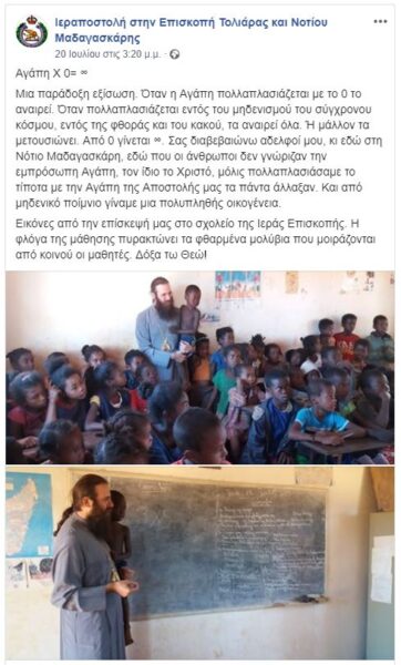 Η σελίδα “Ιεραποστολή στην Επισκοπή Τολιάρας και Νοτίου Μαδαγασκάρης”, δημοσιεύει κείμενο στο κοινωνικό δίκτυο Facebook, κατά τις 20 Ιουλίου 2019 – το οποίο, συνοδεύεται απο εικόνες της επισκέψεως του Επισκόπου Τολιάρας και Νοτίου Μαδαγασκάρης, κ. Προδρόμου, στο σχολείο της Ιεράς Επισκοπής – το οποίο έχει ως εξής: