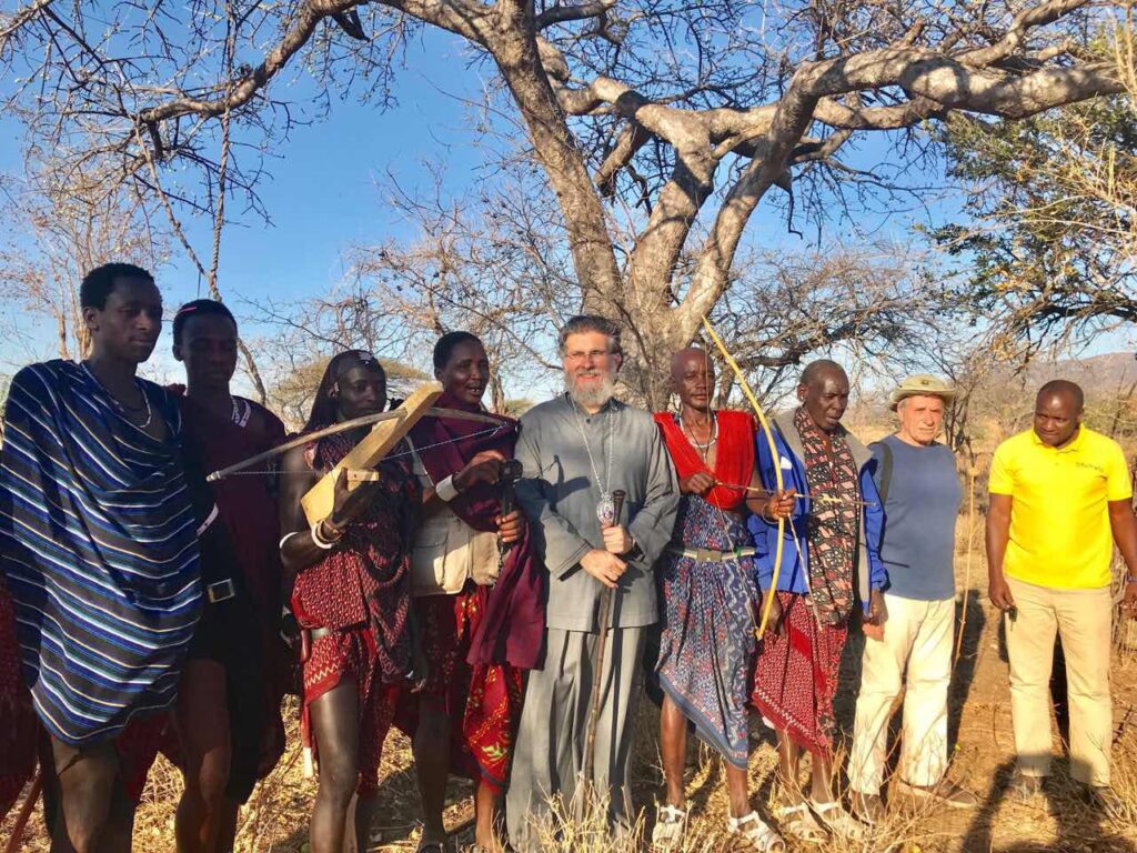 Ο θεοφιλέστατος Επίσκοπος Αρούσας και κεντρικής Τανζανίας πατήρ Αγαθόνικος ψάλλει στην ύπαιθρο την παράκληση στην Παναγία με τους ορθόδοξους Μασάι.