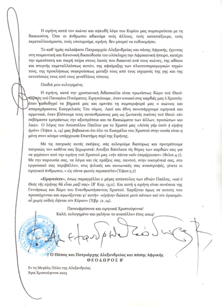 Αναλυτικά το Μήνυμα του Πατριάρχη Αλεξανδρείας: