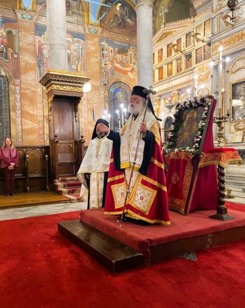 Κατά την ομιλία του ο Μακαριώτατος, στις 19 Απριλίου, παρουσία του Γενικού Προξένου της Ελλάδος στην Αλεξάνδρεια κ. Ιωάννη Πυργάκη, της Προέδρου του Ελληνικού Ναυτικού Ομίλου Αλεξανδρείας και του Συλλόγου Ελλήνων Επιστημόνων «Πτολεμαίος Α’» κας.Λιλίκας-Ειρήνης Θλιβίτου και πιστών εκ της Μ. Πόλεως, επικαλέσθηκε την μεσιτεία της Υπερμάχου Στρατηγού υπέρ της καταπαύσεως των συγκρούσεων μεταξύ των λαών, της ειρηνεύσεως του κόσμου και της ενότητος των Εκκλησιών.