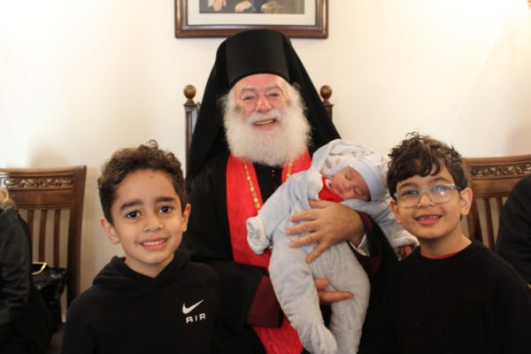 Στη συνέχεια ο Πατριάρχης προσκάλεσε όλους να περάσουν απ’ το Αρχονταρίκι για να κόψουν την Βασιλόπιτα και να κεραστούν καλούδια πρωτοχρονιάτικα. Η ατμόσφαιρα ήταν ζεστή και η προσήνεια και το οικείο χαμόγελο του Μακαριότατου, ενεθάρρυνε πολλούς ταξιδιώτες απ΄ την Ελλάδα να ζητήσουν να φωτογραφηθούν μαζί του, κι εκείνος δεν τους χάλασε χατίρι. Ακολούθως έκοψε την Βασιλόπιτα και με το γνωστό ανθρώπινο χιούμορ του, ρωτούσε «εναγωνίως» τους φίλους που κατέκλυσαν το Αρχονταρίκι, αν τους έτυχε το φλουρί. Όμορφες στιγμές από τον Προκαθήμενο και ακόμα πιο όμορφες όταν στην αγκαλιά του κράτησε το νεογέννητο μωρό του Αραβόφωνου Πατέρα Φάντι.