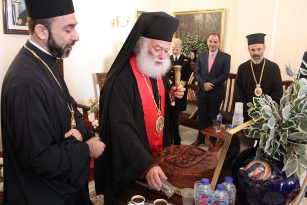 Στη συνέχεια ο Πατριάρχης προσκάλεσε όλους να περάσουν απ’ το Αρχονταρίκι για να κόψουν την Βασιλόπιτα και να κεραστούν καλούδια πρωτοχρονιάτικα. Η ατμόσφαιρα ήταν ζεστή και η προσήνεια και το οικείο χαμόγελο του Μακαριότατου, ενεθάρρυνε πολλούς ταξιδιώτες απ΄ την Ελλάδα να ζητήσουν να φωτογραφηθούν μαζί του, κι εκείνος δεν τους χάλασε χατίρι. Ακολούθως έκοψε την Βασιλόπιτα και με το γνωστό ανθρώπινο χιούμορ του, ρωτούσε «εναγωνίως» τους φίλους που κατέκλυσαν το Αρχονταρίκι, αν τους έτυχε το φλουρί. Όμορφες στιγμές από τον Προκαθήμενο και ακόμα πιο όμορφες όταν στην αγκαλιά του κράτησε το νεογέννητο μωρό του Αραβόφωνου Πατέρα Φάντι.