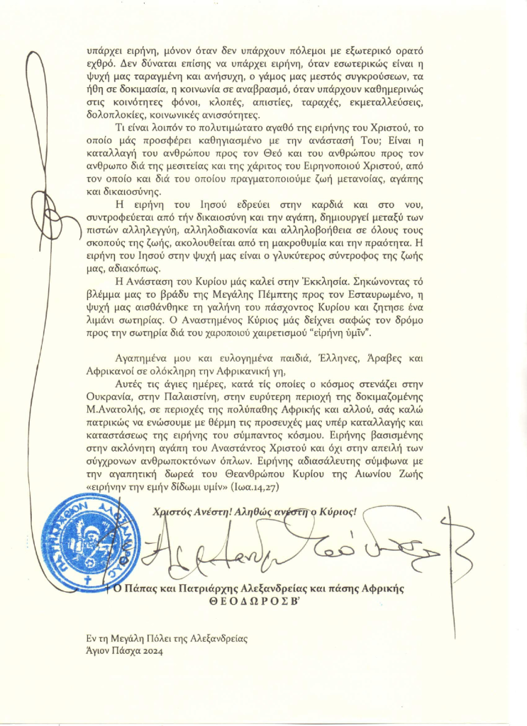 Αυτά αναφέρει μεταξύ άλλων ο Πάπας και Πατριάρχης Αλεξανδρείας και πάσης Αφρικής κ.κ. Θεόδωρος Β’ στην Εγκύκλιό του για το Πάσχα.
