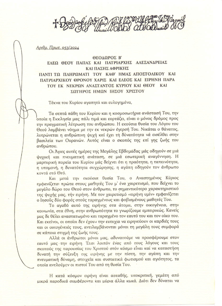 Παρακάτω ολόκληρη η Εγκύκλιος του Πατριάρχη Αλεξανδρείας: