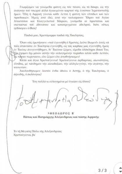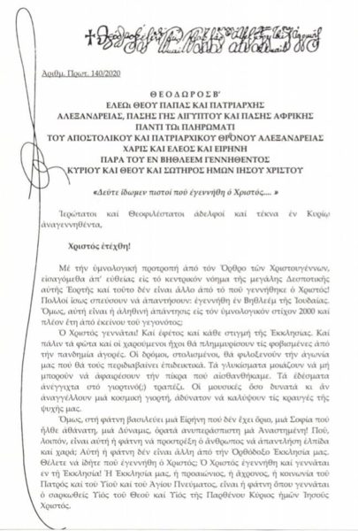 Μεταξύ αυτών που έστειλαν το μήνυμά τους για την ημέρα αυτή είναι και ο Πάπας και Πατριάρχης Αλεξανδρείας και πάσης Αφρικής κ.κ. Θεόδωρος Β’. Ο Μακαριώτατος αρχικά αναφέρει πως “ο Χριστός γεννάται! Και εφέτος και κάθε στιγμή της Εκκλησίας”.