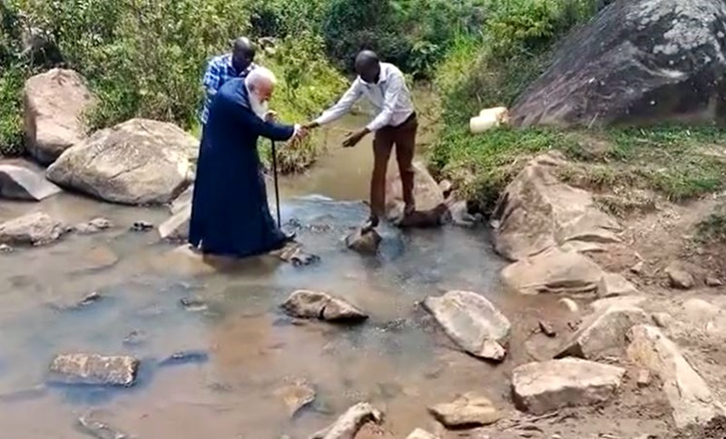 Το αυτοκίνητο δεν μπορούσε να πάει άλλο. Ο δρόμος δεν ήταν τόσο καλός. Ο Σεβ. Μητροπολίτης Γέρων Ναϊρόμπι, Yπέρτιμος και Έξαρχος Κένυας κ. Μακάριος έπρεπε να περάσει ένα μικρό ποτάμι. Σε στιγμές που οι βροχές είναι βαριές, αυτό το μέρος πλημμυρίζει. Τα κατάφερε, όμως. Όλα για την δόξα του Θεού και την ηθική συμπαράσταση των αδελφών στο πλαίσιο της σπουδαίας ποιμαντικής και ιεραποστολικής δράσης του.