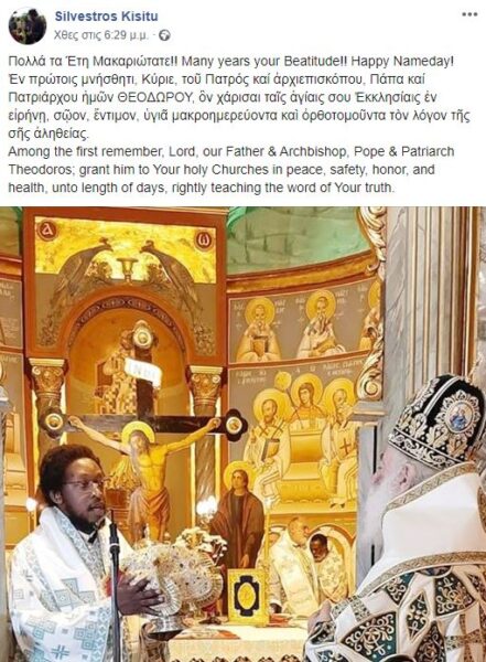 “Πολλά τα Έτη Μακαριώτατε!!” στα ελληνικά, αλλά, και, “Many years your Beatitude!! Happy Nameday!” στα αγγλικά, ευχήθηκε διαδικτυακώς ο Επίσκοπος Γκούλου και Ανατολικής Ουγκάντας κ. Σίλβεστρος προς τον Μακαριώτατο Πατριάρχη Αλεξανδρείας κ.κ. Θεόδωρο, κατά τη χθεσινή ημέρα των Ονομαστηρίων του.