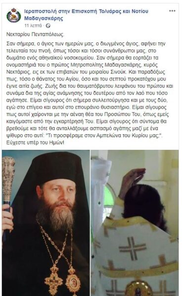 “Σαν σήμερα, ο άγιος των ημερών μας, ο διωγμένος άγιος, αφήνει την τελευταία του πνοή, όπως τόσοι και τόσοι συνάνθρωποι μας, στο δωμάτιο ενός αθηναϊκού νοσοκομείου” γράφει σε επίκαιρη ανάρτησή του, ο Θεοφ. Επίσκοπος Τολιάρας και Νοτίου Μαδαγασκάρης, κ. Πρόδρομος. “Σαν σήμερα, θα εόρταζε τα ονομαστήριά του, ο πρώτος Μητροπολίτης Μαδαγασκάρης, κυρός Νεκτάριος, εις εκ των επιβατών του μοιραίου Σινούκ”.
