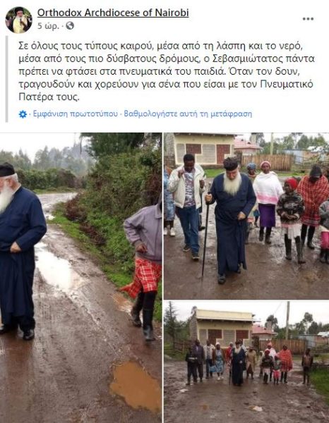 Σε όλους τους τύπους καιρού, μέσα από τη λάσπη και το νερό, μέσα από τους πιο δύσβατους δρόμους, ο Σεβασμιώτατος Μητροπολίτης Γέρων Ναϊρόμπι, Yπέρτιμος και Έξαρχος Κένυας κ. Μακάριος πρέπει να φτάσει στα πνευματικά του παιδιά. Όταν τον δουν, τραγουδούν και χορεύουν γι’ αυτόν που είναι ο πνευματικός πατέρας τους.