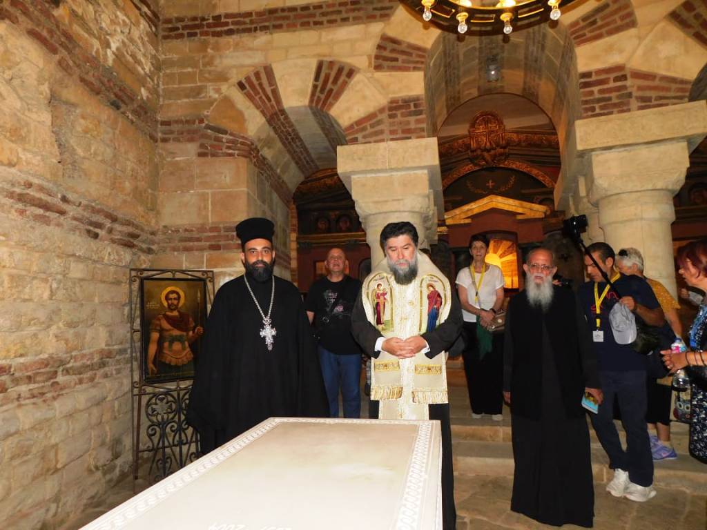 Ο πανοσιολ. Αρχιμανδρίτης π. Δαμασκηνός Alazrai, Καθηγούμενος της παλαιφάτου ιεράς Μονής του Αγ. Γεωργίου, υποδέχθηκε προφρόνως τον Σεβ. κ. Θεολόγο και τους Σερραίους προσκυνητές, στο μεγαλοπρεπές Καθολικό της Μονής, γνωστό και ως «Ροτόντα της Ανατολής», το οποίο κτίσθηκε επάνω σε τριώροφο αρχαίο ρωμαϊκό Πύργο και αποτελεί ένα από τα σημαντικότερα χριστιανικά προσκυνήματα της Νειλοχώρας. Εκεί, με αισθήματα βαθείας κατανύξεως και ευλαβείας, οι προσκυνητές ασπάσθηκαν την θαυματουργό εικόνα του Αγ. Γεωργίου, η οποία διασώθηκε από την καταστροφική πυρκαγιά του έτους 1904, που κατέκαψε το Ναό, καθώς και τεμάχια ιερών λειψάνων, τα οποία φυλάσσονται στην ιερά Μονή, από αιώνων πολλών, ως πολυτιμότατος πνευματικός θησαυρός και πηγή ευλογίας και αγιασμού.
