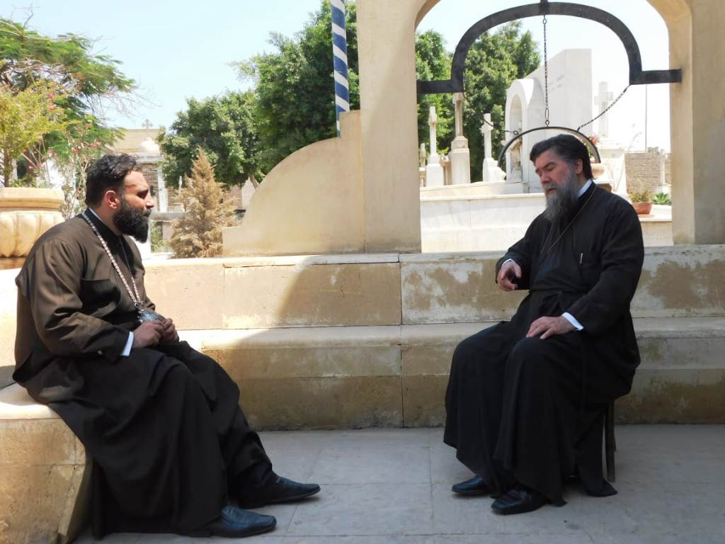Ο πανοσιολ. π. Δαμασκηνός, αφού μετέφερε καθηκόντως στον Σεβασμιώτατο και την συνοδεία του τις σεπτές Πατριαρχικές ευχές του Μακαριωτάτου Προκαθημένου της Αλεξανδρινής Εκκλησίας κ. Θεοδώρου Β’, αναφέρθηκε στην μακραίωνη ιστορία της ιεράς Μονής Αγ. Γεωργίου, η οποία αποτελεί πόλο πνευματικής και πολιτιστικής έλξεως, όχι μόνο για τους Ορθοδόξους, αλλά και για τους Κόπτες, Καθολικούς και Μουσουλμάνους. Επεσήμανε επίσης το γεγονός της από του έτους 2005 εκ βάθρων ανακαινίσεως της ιεράς Μονής, τονίζοντας ότι αποτελεί παράδειγμα αρμονικής και αγαστής συνεργασίας Ελλήνων και Αιγυπτίων, Χριστιανών και Μουσουλμάνων, που με την πεπνυμένη καθοδήγηση του Μακ. Πατριάρχου κ. Θεοδώρου Β’, διέσωσαν από την φθορά του χρόνου και ανέδειξαν με τον καλύτερο τρόπο το μοναδικό αυτό μνημείο της παγκόσμιας χριστιανικής κληρονομιάς. Επίσης, το έτος 2020 ανακαινίσθηκαν εκ βάθρων το ιερό Παρεκκλήσιο-Κρύπτη του Αγ. ένδοξου μεγαλομάρτυρος Θεοδώρου καθώς και οι ελληνορωμαϊκές Κατακόμβες.