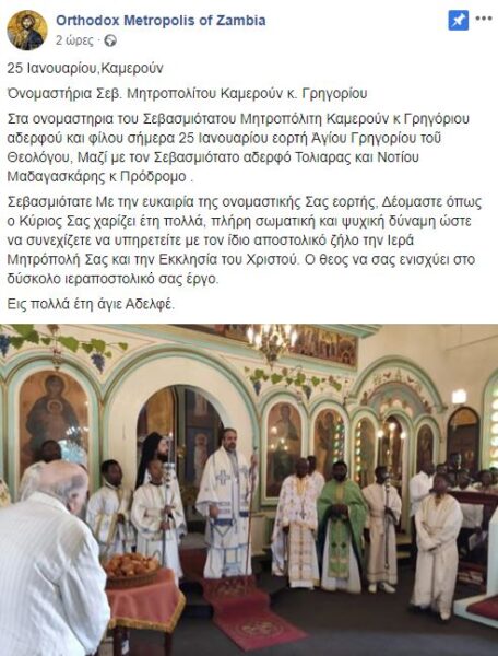 Ονομαστήρια του Σεβασμιώτατου Μητροπόλιτου Καμερούν κ. Γρηγόριου, κατά το Σάββατο 25 Ιανουαρίου 2020, εορτή του Αγίου Γρηγορίου του Θεολόγου, παρουσία του Μητροπολίτου Ζάμπιας κ. Ιωάννου και του Επισκόπου Τολιάρας και Νοτίου Μαδαγασκάρης, κ. Προδρόμου.