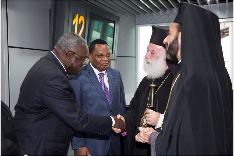 Στο διεθνή αερολιμένα Maya-Maya τον Μακαριώτατο υποδέχθησαν ο Σεβ.Μητροπολίτης Μπραζαβίλ και Γκαμπόν κ.Παντελεήμων, ο Εξοχ. Υπουργός Εξωτερικών κ.Jean Claude Gakosso, o Εξοχ. Υπουργός Πολιτισμού κ. Dieudonné Moyondo, ο Εξοχ. Κυβερνήτης Μπραζαβίλ, ο Εξοχ.Πρέσβυς της Αιγύπτου κ.Halem Hassan Kandit, o Εντιμ. Πρόξενος ε.τ. της Ελλάδος κ.Νικόλαος Περρής, ο κ.Δήμαρχος Μπραζαβίλ, κληρικοί, εκπρόσωποι των στρατιωτικών αρχών, των σωμάτων ασφαλείας και πλήθος πιστών. Το μεσημέρι ο Μακαριώτατος παρεκάθησε σε γεύμα, το οποίο παρέθεσε το Προξενείο της Ελλάδος.