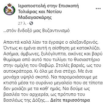 Σε ανάρτησή στην σελίδα της Ιεραποστολής στην Επισκοπή Τολιάρας και Νοτίου Μαδαγασκάρης έγραψε:
