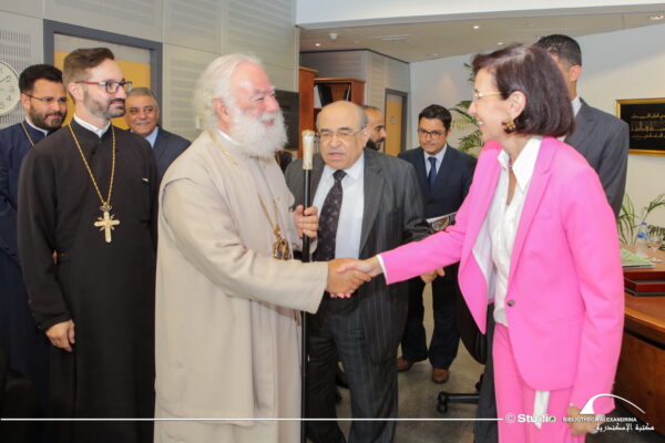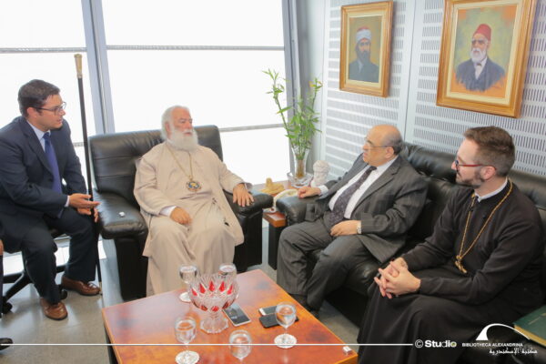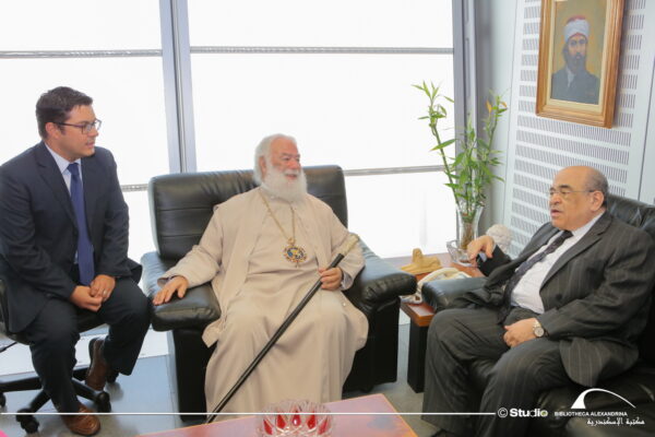 Ο Πάπας και Πατριάρχης Αλεξανδρείας και πάσης Αφρικής κ. κ. Θεόδωρος Β’, συνοδευόμενος από τον Αρχιμ. κ. Νικόδημο Τοτκα, Αρχιγραμματέα του Πατριαρχείου και τον Αρχιμ. π Χρυσόστομο Volante, έτυχε χθες θερμής υποδοχής από τον Διευθυντή της Ιστορικής Αλεξανδρινής Βιβλιοθήκης, Dr. Mostafa ElFeki, μετά από πρόσκληση του ιδίου, στο Γραφείο του στο κτήριο της Βιβλιοθήκης.