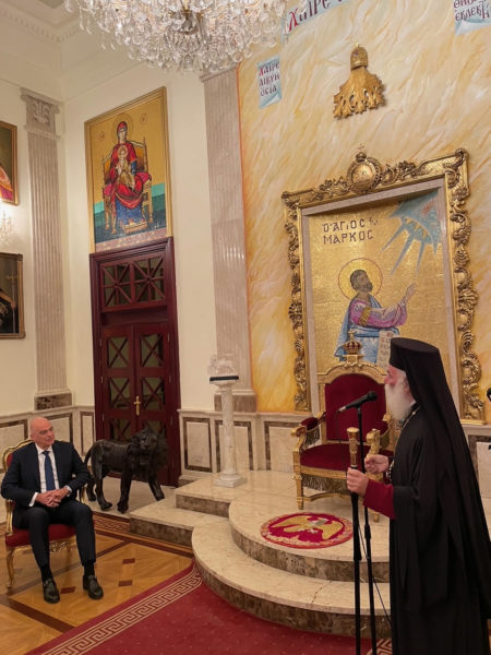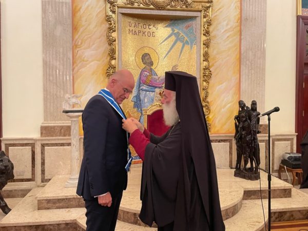 Κατακλείων ο Μακαριώτατος απένειμε στον Υπουργό την ανώτατη τιμητική διάκριση του Θρόνου, τον Μεγαλόσταυρο του Αγίου Μάρκου μετ’ αστέρος.
