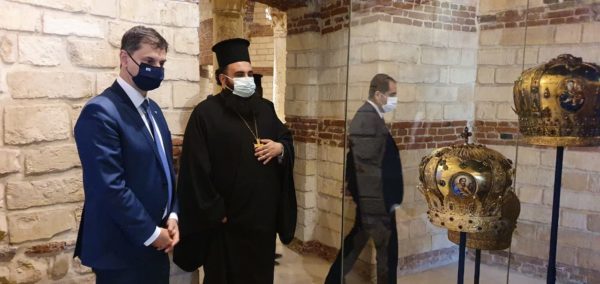 Ο Πατριάρχης Θεόδωρος προσέφερε βιβλία και αναμνηστικά της Ιεράς Μονής του Αγίου Γεωργίου και ο υπουργός έδωσε στον Πατριάρχη, ένα δώρο για το γραφείο του.