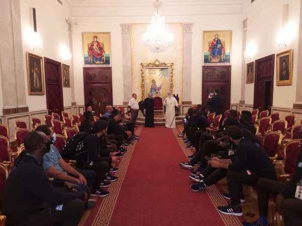 Σήμερα, Πέμπτη, 30 Σεπτεμβρίου 2021, η Α.Θ.Μ. ο Πάπας και Πατριάρχης Αλεξανδρείας και πάσης Αφρικής κ.κ. Θεόδωρος Β’, υποδέχθηκε με ιδιαίτερη χαρά στην Πατριαρχική Καθέδρα την 20μελή αποστολή της ομάδας μπάσκετ «Ελληνική Αθλητική Οργάνωση ΕΛΛΑΣ-ΣΟΥΔΑΝ «ΣΠΑΡΤΑΝΣ»», συνοδευόμενη από τον Σεβασμιώτατο Μητροπολίτη Νουβίας κ. Σάββα, τον Πρόεδρο της Ελληνικής Κοινότητος Χαρτούμ και τον Εκπρόσωπο της Ομοσπονδίας Καλαθοσφαίρισης του Σουδάν, η οποία βρίσκεται στην Αλεξάνδρεια με σκοπό την συμμετοχή της στο Αραβικό πρωτάθλημα μπάσκετ.