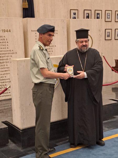 Ο Διοικητής της Στρατιωτικής Σχολής Ευελπίδων, Υποστράτηγος Αναστάσιος Πολύχρονος, προσέφερε από την πλευρά του στον Σεβασμιώτατο κ. Ιωάννη το έμβλημα της Σχολής.